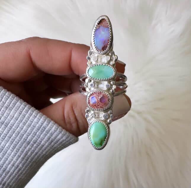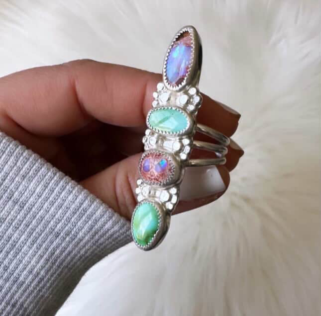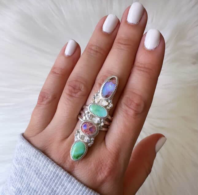 High grade Sonoran Mountain Turquoise and purple Mexican fire Opal, set in solid sterling silver 925, with a triple split ring band in a polished finish.