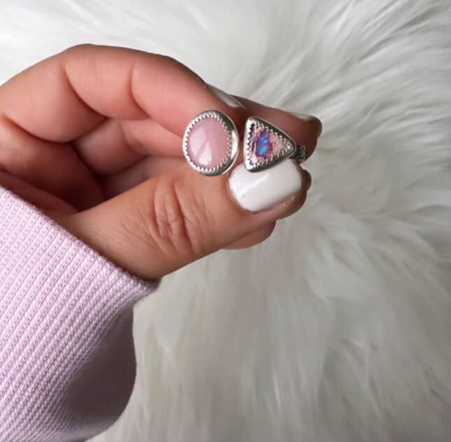 Mexican fire Opal and Pink Opal, set in sterling silver 925, with a stamped ring band.