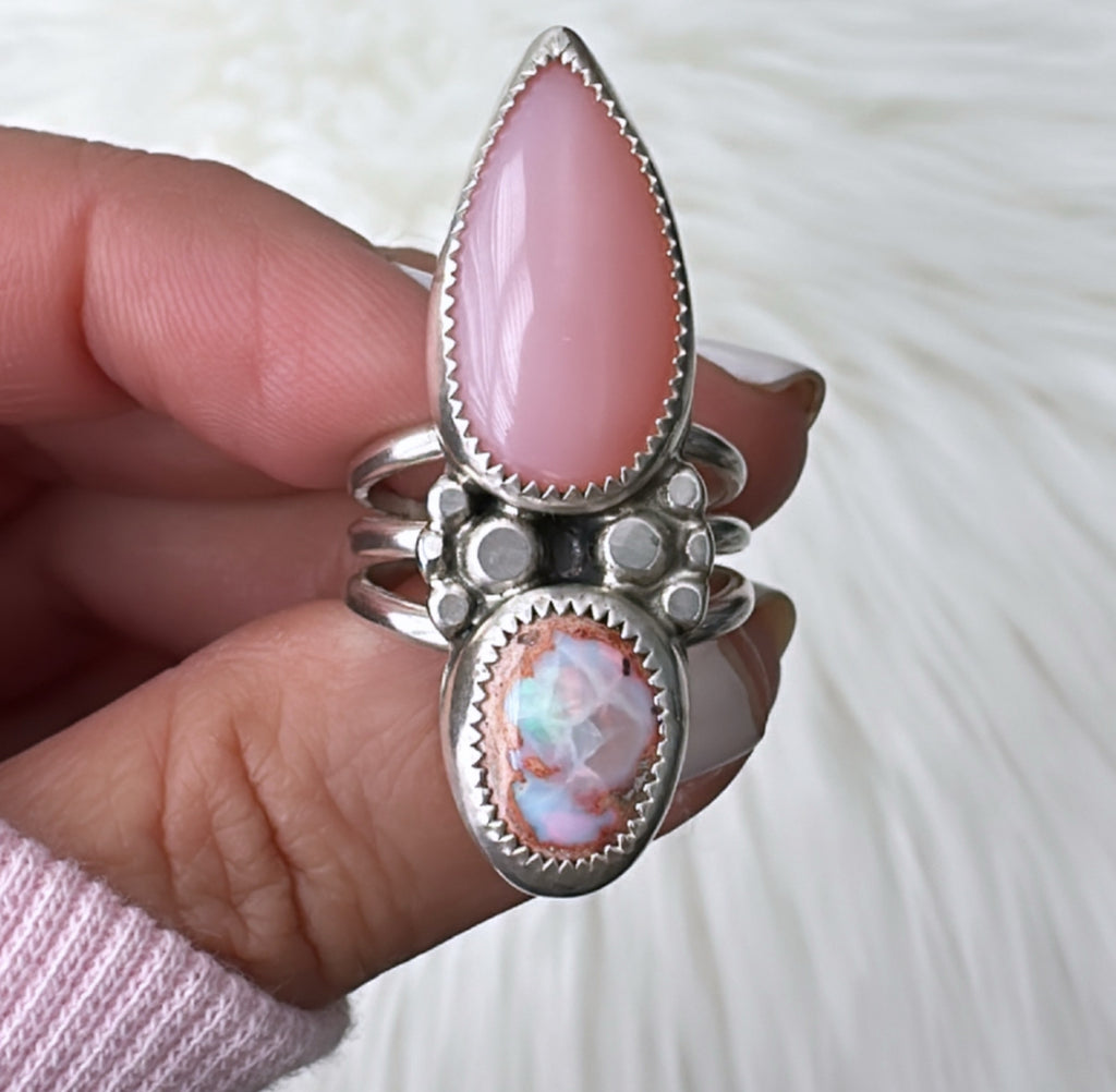 Size 8 / Pink Opal and Mexican Fire Opal ring