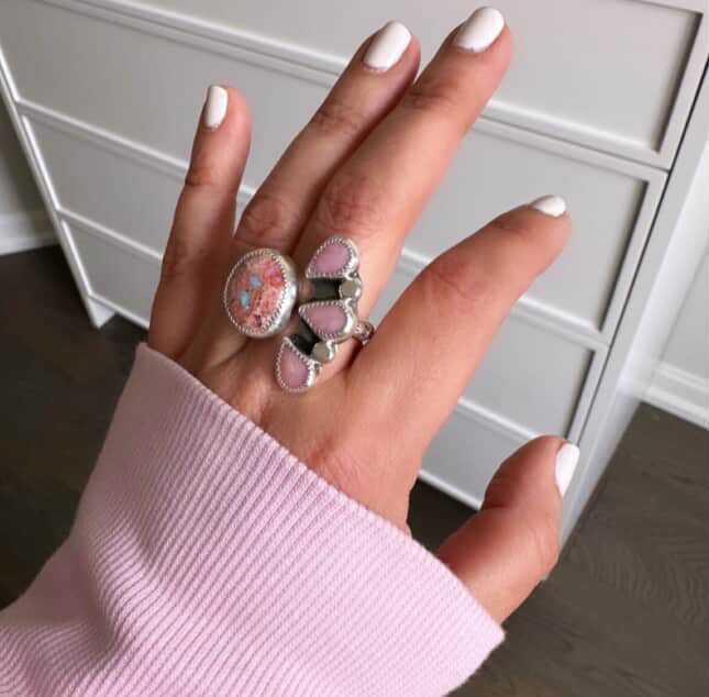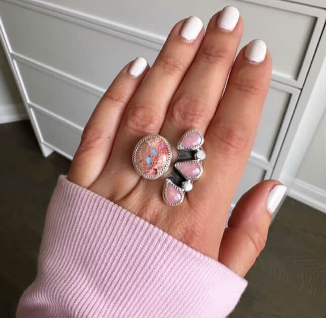 Mexican fire opal and Pink Opal Cluster Ring, set in sterling silver 925, with a thick half round stamped ring band
