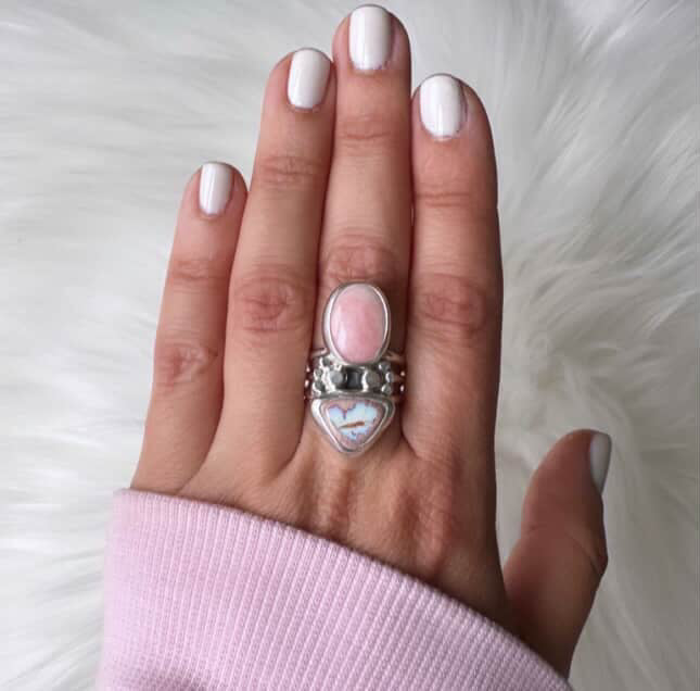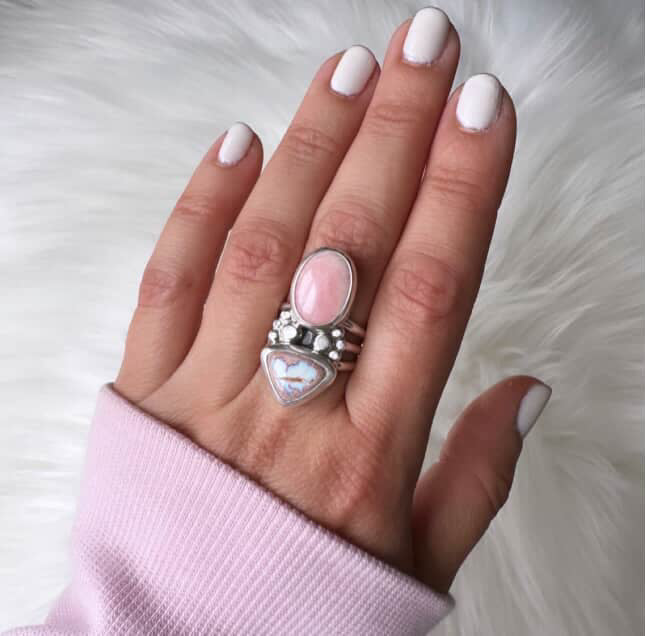 Pink Opal and Mexican Fire Opal set in solid Sterling silver in a polished finish with a triple split ring band